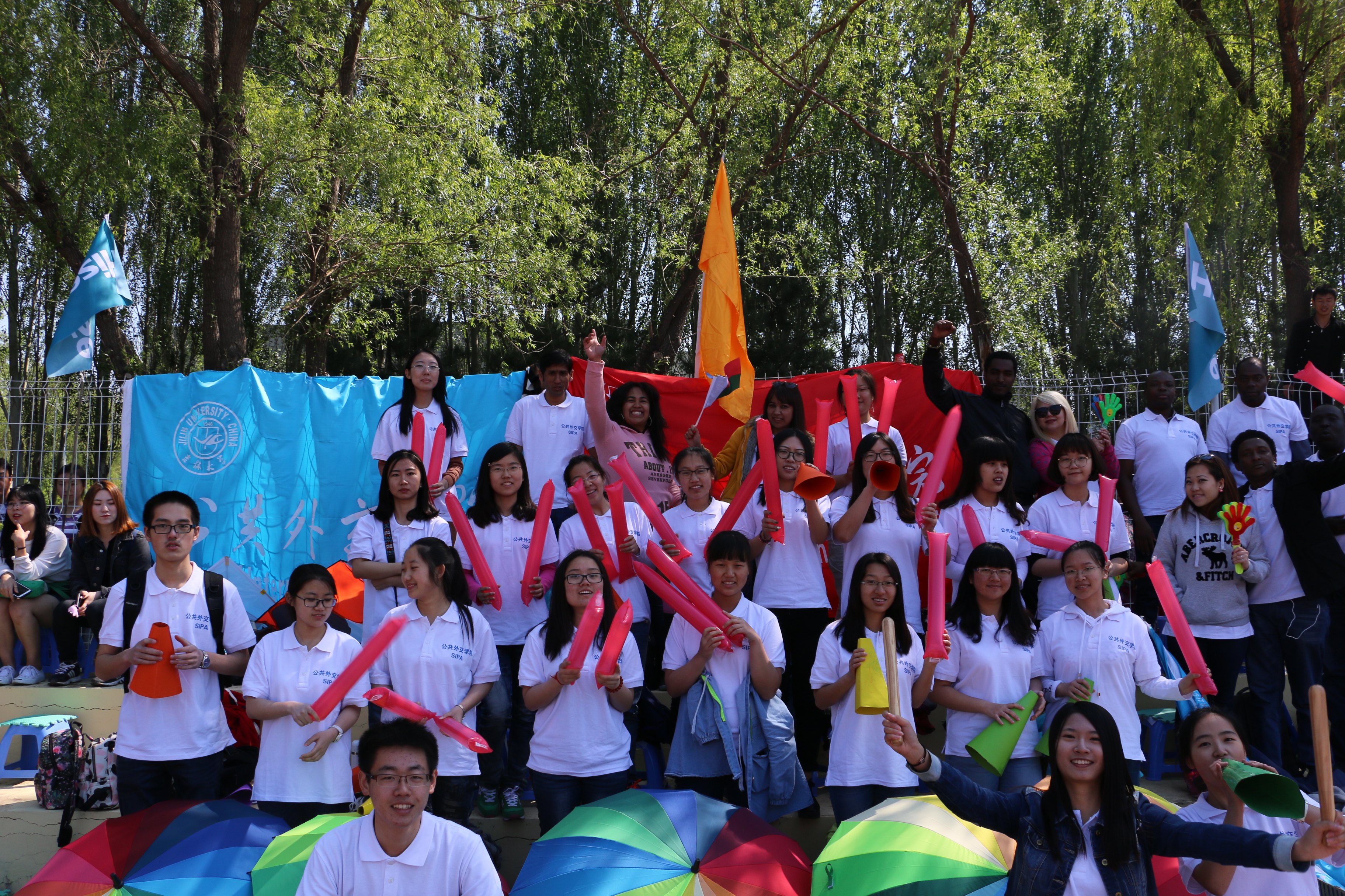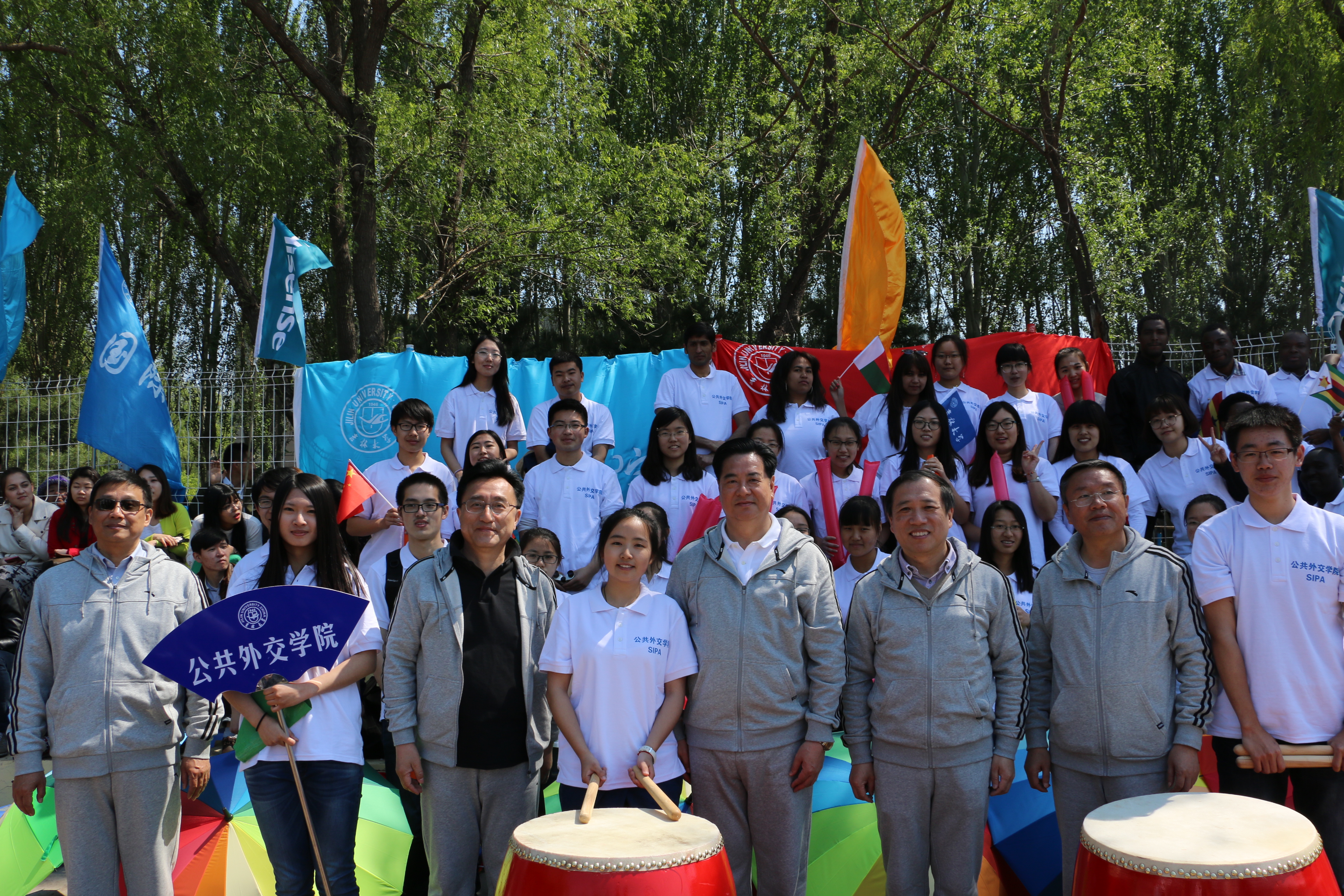 观众席时,被学生们响亮的歌声和口号声吸引了。李元元校长来到同学们中间,亲切地和大家说:“你们是首届公共外交专业的学生,我刚才在主席台上看到你们了,非常棒,希望你们取得好成绩”!随后,李校长还与学生们一起击起了大鼓,在同学们的一致邀请下,杨振斌书记、李元元校长等校领导与师生们合影留念。