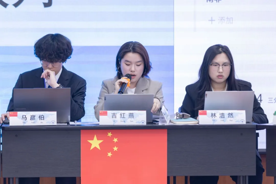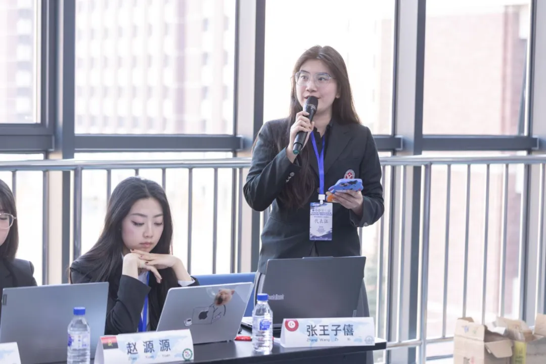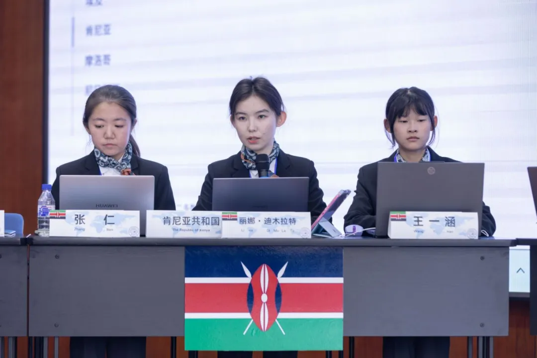 文学院2023级本科生王李同学作为参赛学生代表发言。她认为,模拟外交谈判不仅是一场竞技,更是一次学术与思想的碰撞,呼吁各位参赛选手在活动过程中不仅要推动“一带一路”倡议持续迸发活力,还要秉持世界眼光,协调各方利益,达成合作共识,展现出中非合作的潜力。
