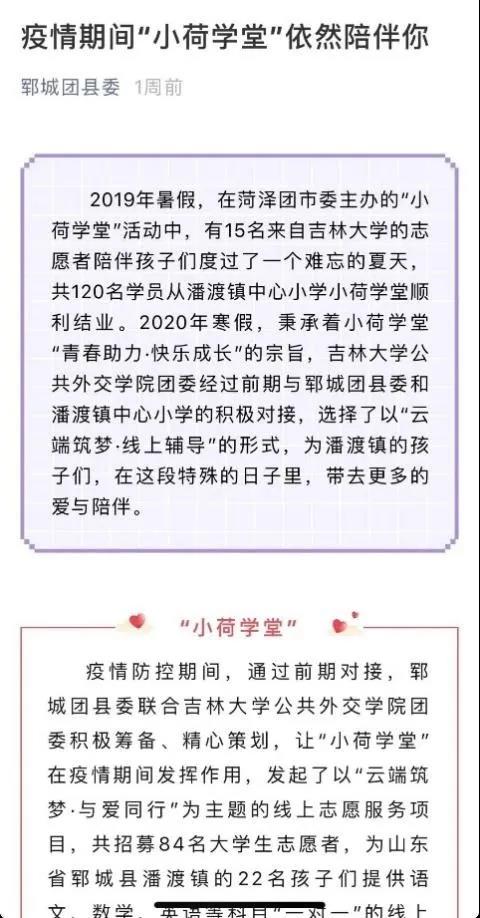 本项目既是对支教地学生线上学习的有益补充,又是对“互联网+志愿服务”的一次积极探索,获得了来自学生、家长及社会的多方肯定。山东省郓城团县委在3月13日于微信公众平台发布“疫情期间,‘小荷学堂’依然陪伴你”推文,对本次活动进行了专题报道。山东省郓城县潘渡镇中心小学专门向 bilibili下载