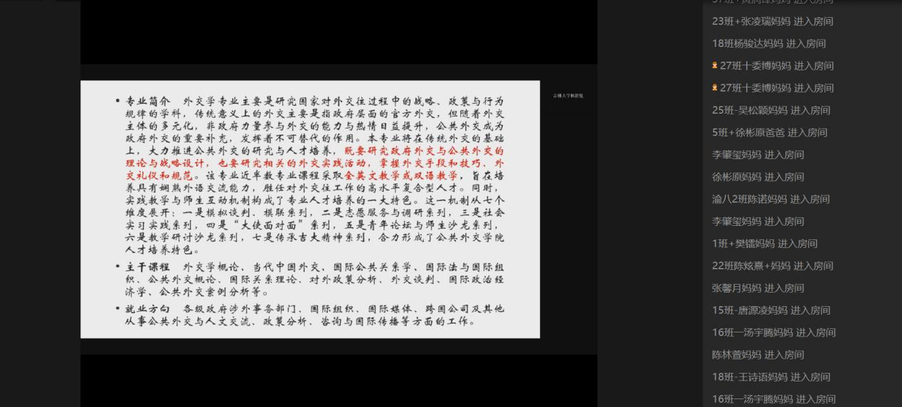 2020级本科生杨欣悦的带领下,采用了更加灵活的线上形式进行宣讲,并借此创新性地邀请家长参与到宣讲活动中来。尽管隔着屏幕,但我们仍能感受到宣讲团队的认真踏实的准备工作和广大同学、家长朋友们的热情参与。