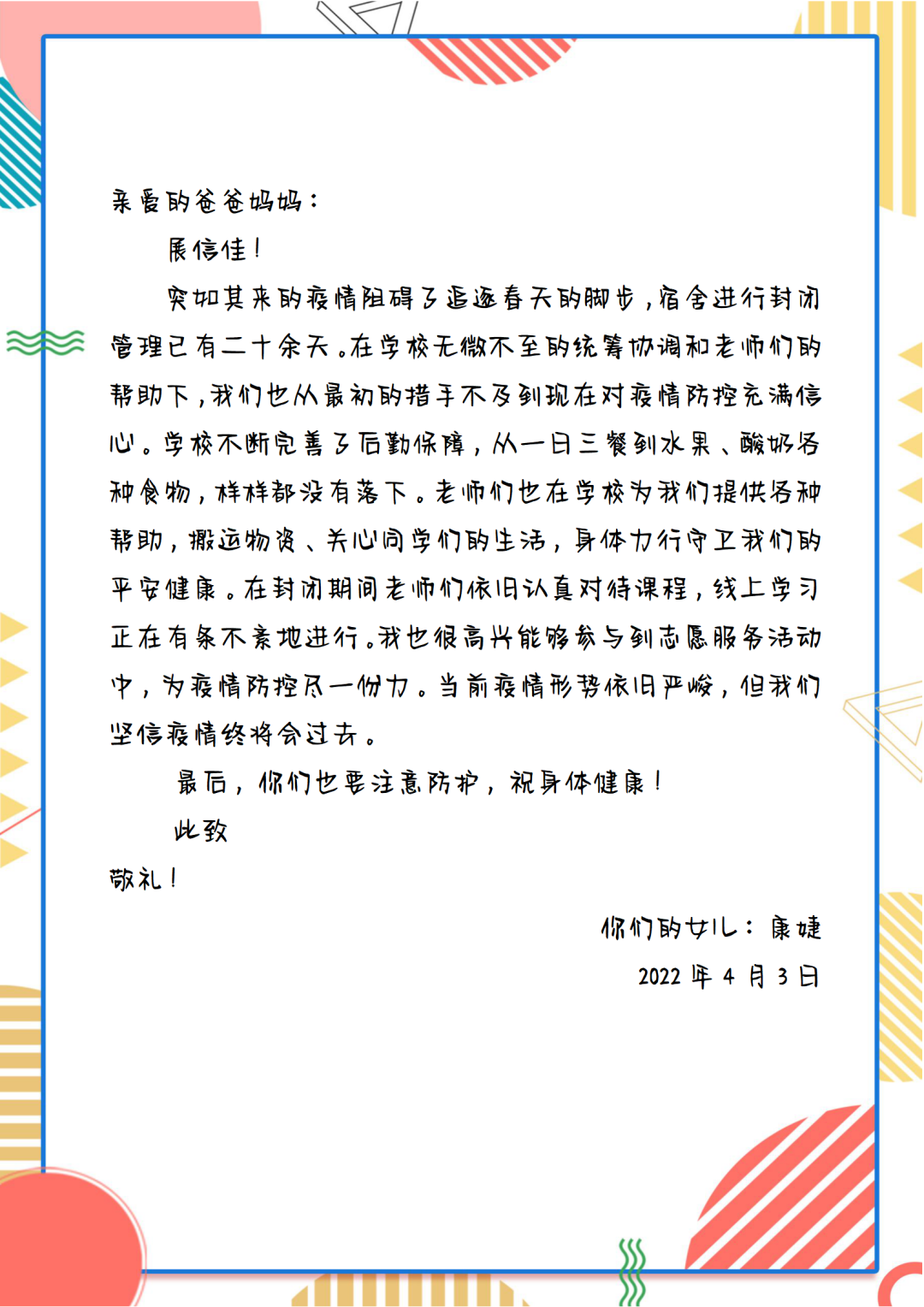 举办了一封“家书”征集活动,鼓励外交学子们给家人写一封家书,介绍封校期间的学习生活情况,传达自己的封寝感受,分享自己的抗疫志愿活动经历。