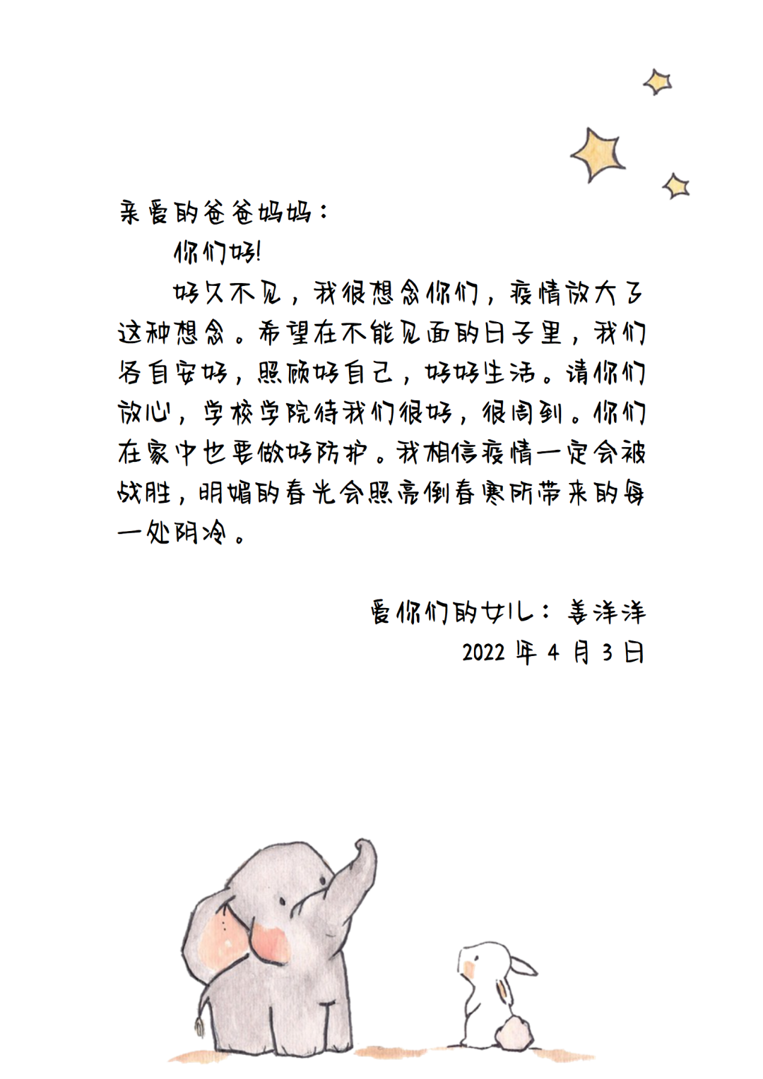 突如其来的疫情给大家正常的学习生活按下了暂停键,在封校的二十多天里,在与吉大同呼吸、共命运的二十多天里,在与老师、同学们一同抗击疫情的二十多天里,无数的思念与牵挂深埋心中,一个个情真意切的字眼,一封封绵绵真情的家书,承载着学子们赤诚的情意。我们也相信,当远方挂念着家中儿女的亲人们收到这些信的时候,心情一定是激动的、安心的。