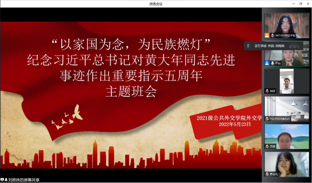 在习近平总书记对黄大年同志先进事迹作出重要指示五周年之际,通过召开主题班会,学习总书记讲话精神,重温黄大年老师先进事迹,外交学学子坚定理想信念,厚植家国情怀。黄大年老师的事迹激励一代又一代学子,吉大师生将始终牢记总书记的殷殷嘱托,求真务实,刻苦钻研,弘扬黄大年精神,传承黄大年事业,踏着黄大年老师的足迹不懈奋斗,在各自学科领域创造辉煌成就,以实际行动迎接党的二十大胜利召开。