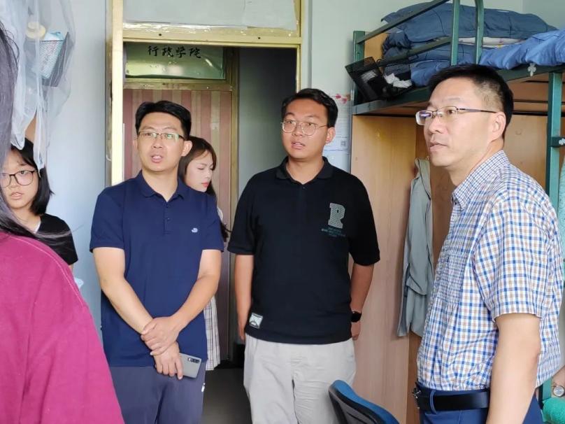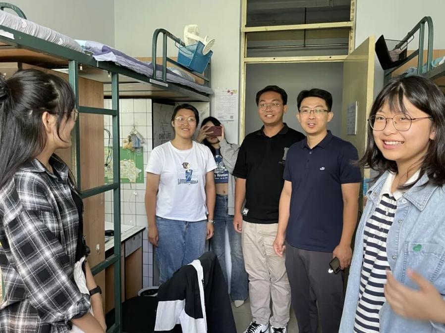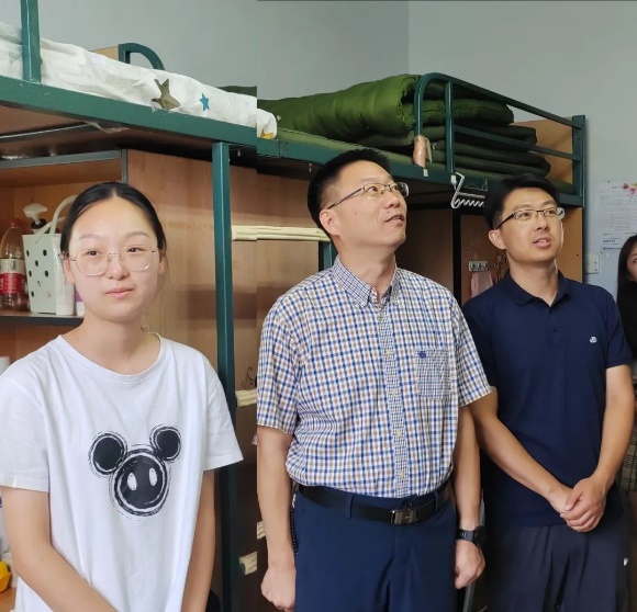 党委书记杨民老师、党委副书记兼副院长王力老师、2023级新生辅导员单葆龙老师走进学生公寓看望新同学们。