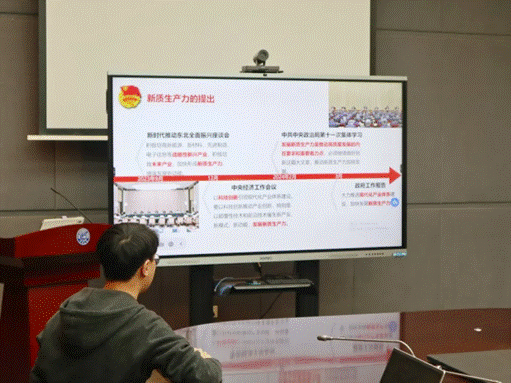 活动伊始,外国语学院赵文祥同学向在场的团员们详细解读了“新质生产力”的内涵及其提出背景,强调了发展“新质生产力”对于提升我国国际地位和影响力的重要地位和意义。