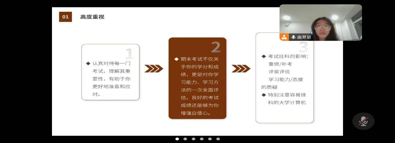 分享会上,曲同学从备考态度、备考行动以及备考策略等方面与同学们进行了分享。曲同学特别提醒了备考态度和制定复习计划的重要性,让面临大学首次期末考试的新生们对于期末考试有了一定的了解,同时增强了对期末考试的信心。分享会最后,曲同学还特意提醒同学们要诚信考试,杜绝任何形式的作弊,预祝大家期末取得好成绩。