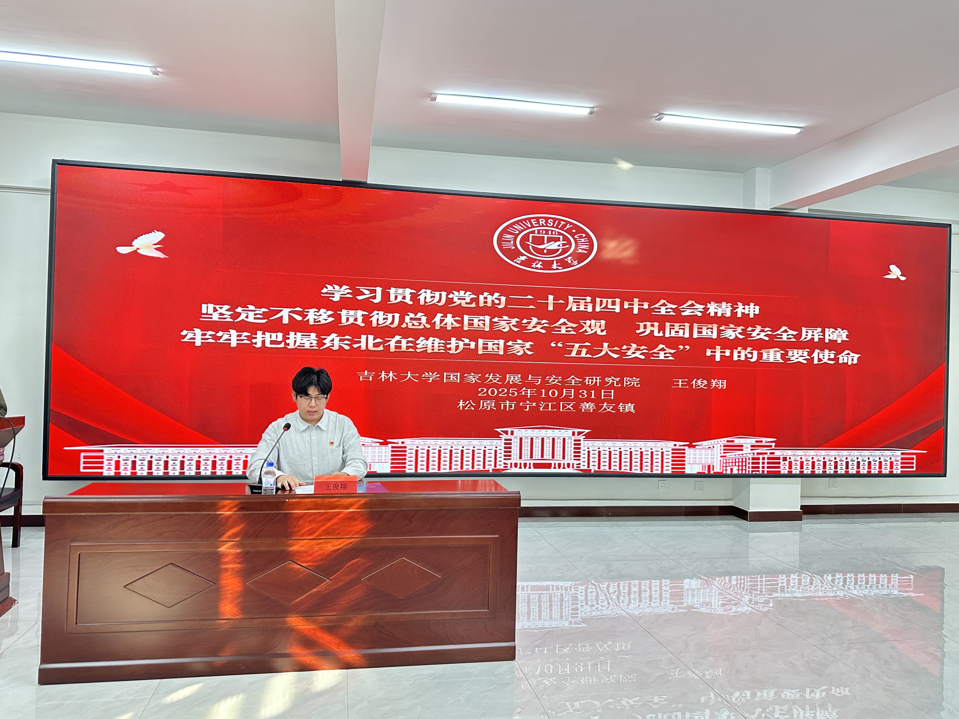 为推动国家安全宣传教育进机关、进乡村,协会负责人王俊翔同学为乡镇机关干部和村民群众带来了一场接地气、有温度的专题宣讲。他结合自己在学习党的二十届四中全会精神的过程中产生的思考与体会,领学和讲解了当前国家安全形势、总体国家安全观的科学内涵、东北在维护国家“五大安全”的重要使命等内容,以期助力基层干部群众增强国家安全意识和素养。