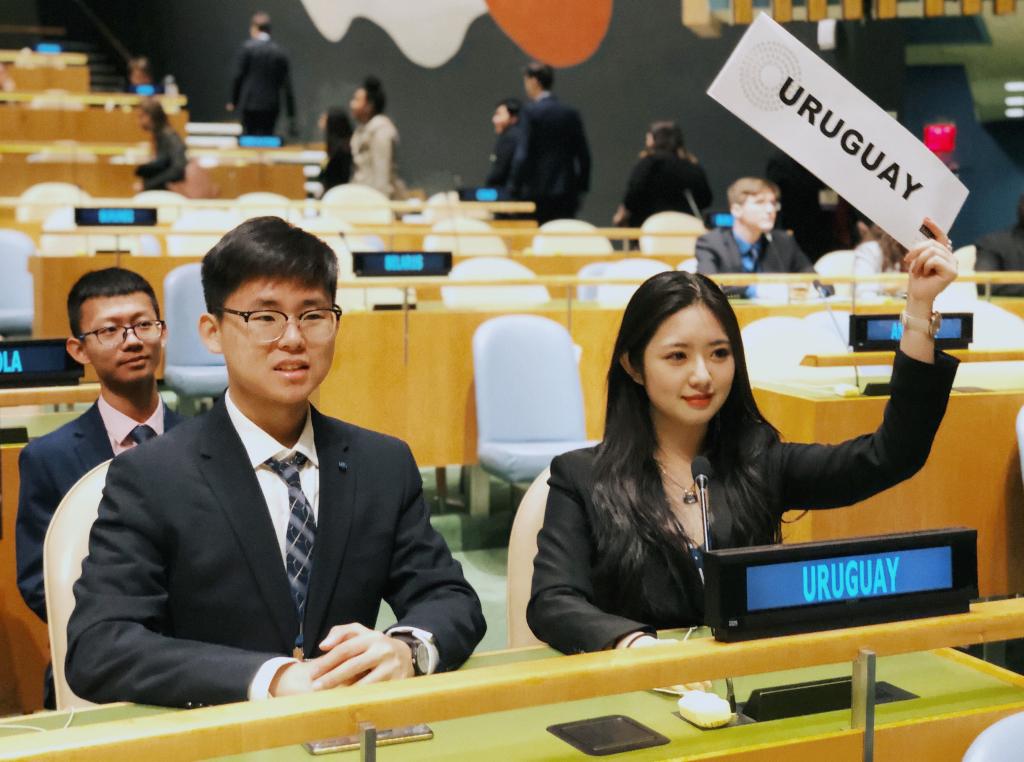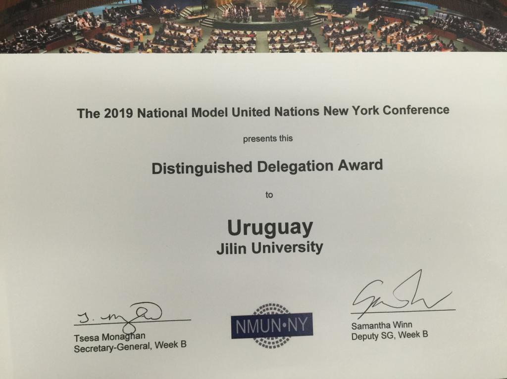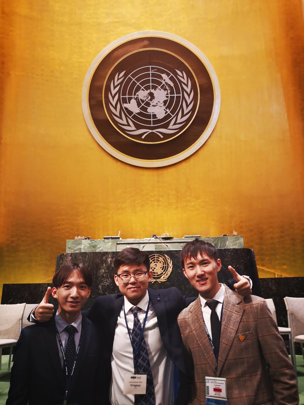 学生陈中山、刘治辰、彭泰仲分别代表乌拉圭出席联大第一委员会、联大第三委员会及联合国气候变化框架公约缔约国会议等3个委员会的会议并贡献条款。其中,陈中山同学与其搭档累积演讲(speech)3次,提出动议(motion)1次,担任会务成员(pager)1次,成功加入4个决议案(sponsor)并贡献条款共计8条(clauses),成功签署条约9份。刘治辰同学及其搭档累积演讲(speech)2次,提出动议(motion)1次,担任会务成员(pager)1次,成功加入3个决议案(sponsor)并贡献条款共计8条(clauses),成功签署条约10份。彭泰仲同学及其搭档收获最佳立场文件奖1项,累积演讲(speech)3次,提出动议(motion)1次,担任会务成员(pager)2次,成功加入3个决议案(sponsor)并贡献条款共计3条(clauses)。
