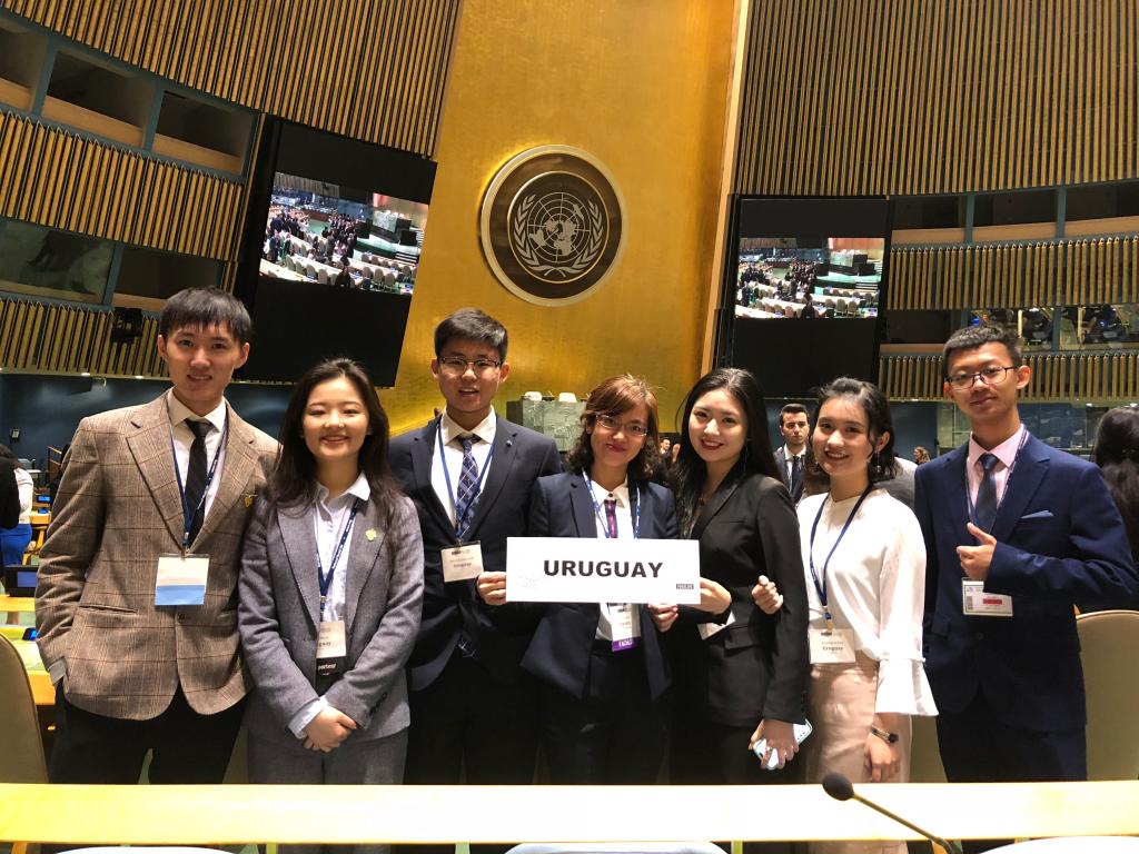 代表团19人(17位学生代表和2名指导教师),模拟代表乌拉圭,参加了联合国大会第一、第二、第三委员会(General Assembly First, Second and Third Committee)、联合国经济及社会理事会(Economic and Social Council Plenary)、联合国环境大会(United Nations Environment Assembly)、维和行动特别委员会(Special Committee on Peacekeeping Operation, C-34)、联合国难民署(United Nations High Commissioner for Refugees)、妇女地位委员会(Commission on the Status of Women)、联合国气候变化框架公约缔约国(COP)、预防犯罪和刑事司法委员会(Commission on Crime Prevention and Criminal Justice, CCPCJ)等10个委员会的正式会议。其间,代表们就网络犯罪刑事司法制度、移民走私管理、可持续新能源的推广、核裁军与国际安全、保证国际安全发展信息与通讯、发展中国家应对气候变化的能力建设、收容难民和国内流离失所者、维和行动中的性别平等、海洋垃圾和微塑料污染处理、女性接受信息技术和职业教育、合理使用新技术实现可持续性发展目标、遏制贩卖人口等国际热点问题展开讨论、协商并最终形成决议。