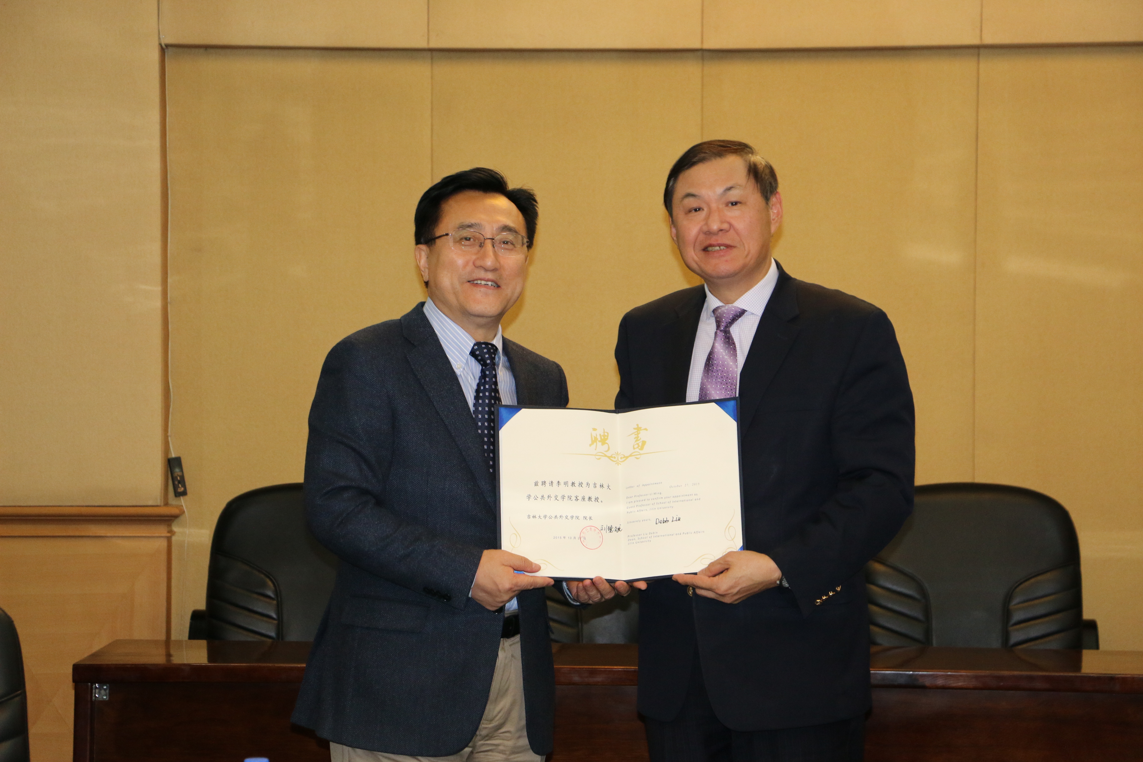 及全校师生做了"未来朝韩关系及中国的角色(Future North-South Korean Relations and China's Role)"、“2016年台湾大选:美国的角色”与“中国的公共外交:发展与前景”三场学术报告。报告分别围绕朝鲜半岛问题的历史与现实,台湾岛内的政治局势、党派博弈及美国在其中的立场与主张,公共外交的内涵、外延与中国公共外交的历史沿革、机遇与挑战,从一个台湾学者的角度向观众展示了认识与研究相关问题的不同视角,受到了广大师生的积极反响与热烈欢迎。