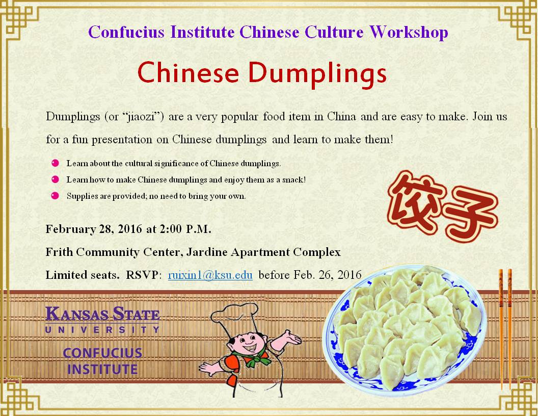 和堪萨斯州立大学合作建设的孔子学院开展了一次以“饺子”为主题的中国饮食文化体验活动,包括研究生院、商学院、农学院、校友服务中心、国际学生中心、饮食住宿服务中心等各单位的50余名学校各部门员工及部分社区人员参加了此次活动。
