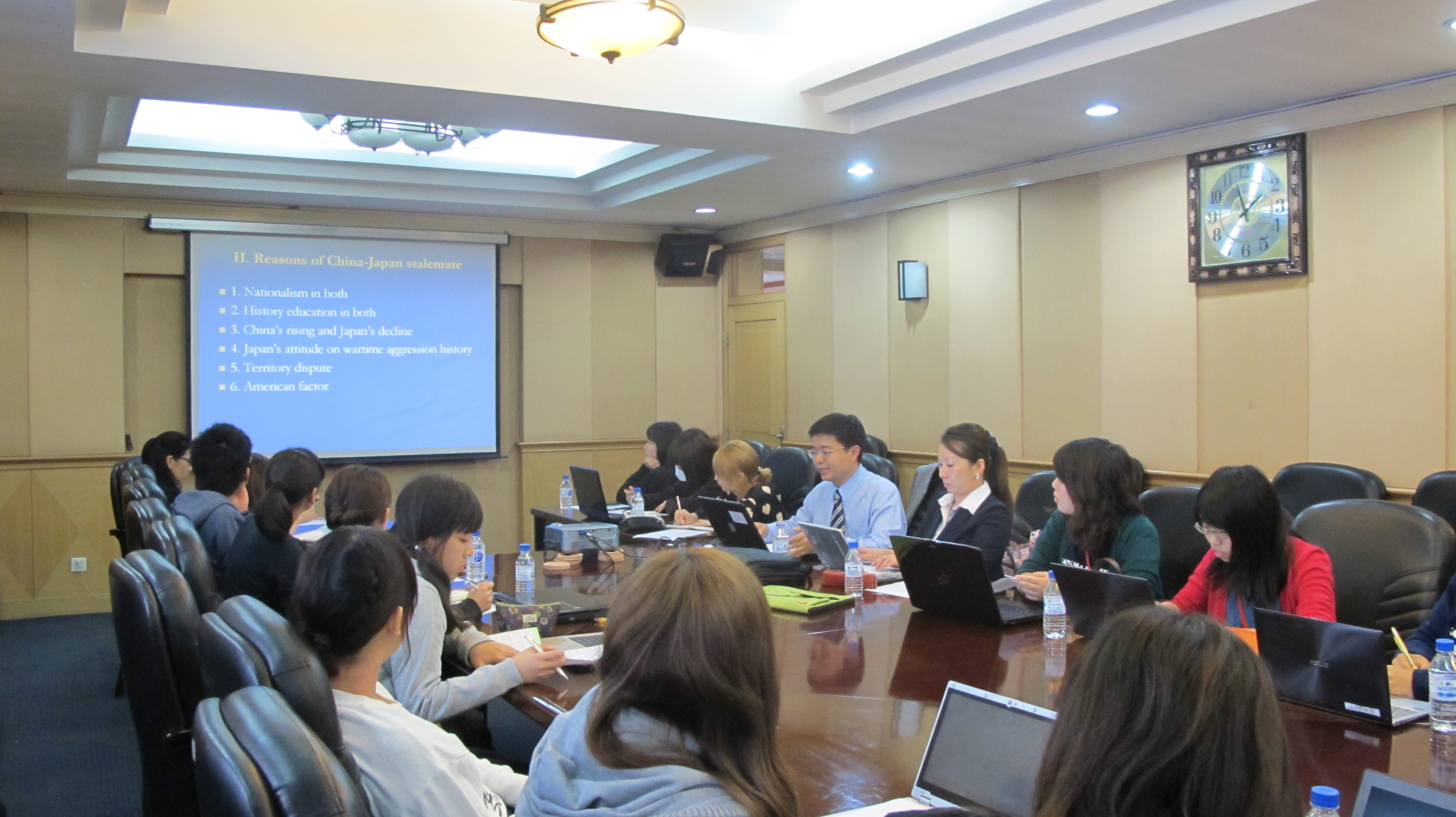 学生代表随后分别对各自学校的基本概况及当地风土人情进行了细致而活泼的描述,并分小组就上述内容进行了热烈讨论;23日下午,王秋彬副院长为冈山大学学生做了主旨为“中日关系再思考”的专题讲座,在学生中间引起反响与共鸣,现场师生就相关议题进行了坦诚的问答与交流;24日上午,学院教师王黎教授分别从历史与现实的角度对中日两国的互动与交流进行阐释,并解答了同学们围绕该领域所提出的问题。活动结束前夕,冈山大学的同学们用PPT的形式回顾总结了几天来在长春的体验与收获,对 bilibili下载