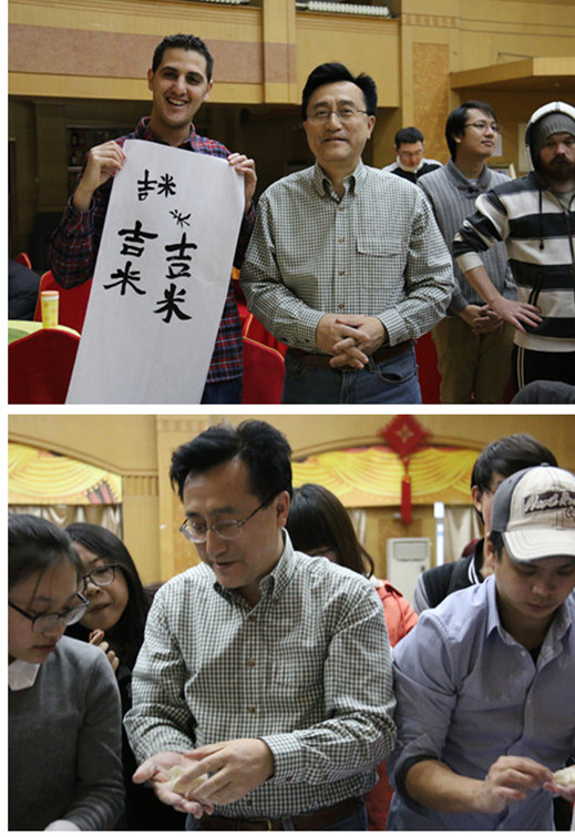 院长刘德斌教授和中外教师也参加了此次活动。刘德斌亲自为中外学生擀饺子皮,手把手教大家包饺子;他还饶有兴致地教留学生用毛笔字写自己的中文名字。最后,大家围坐在桌前吃起了自己包的饺子,虽然饺子看起来不太美观,但味道却是出奇的好。