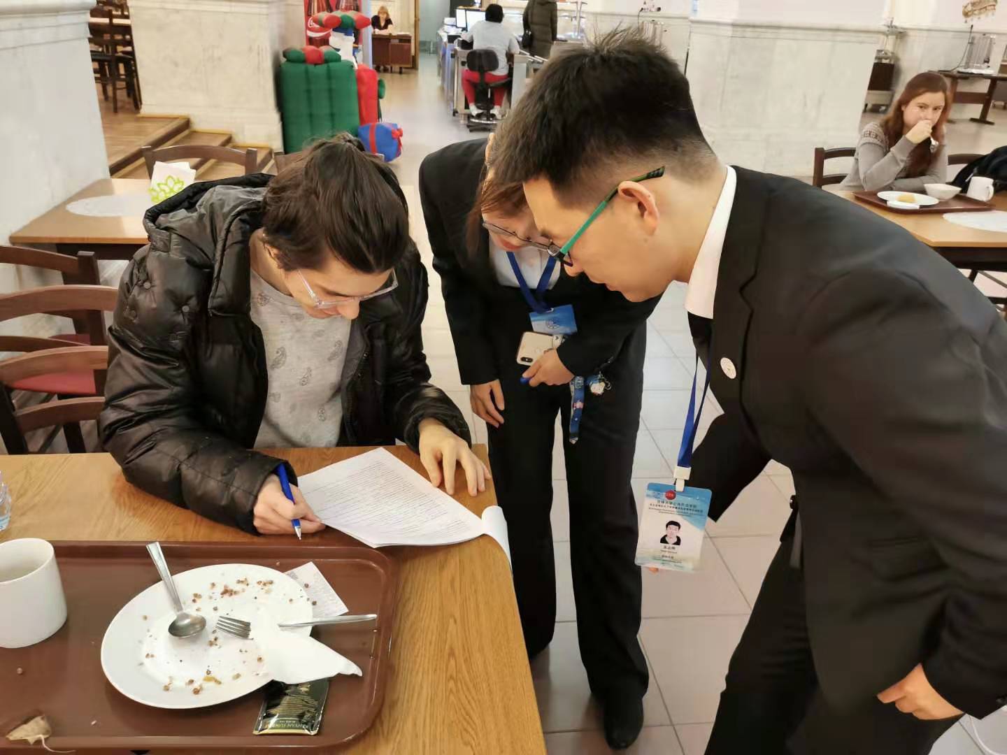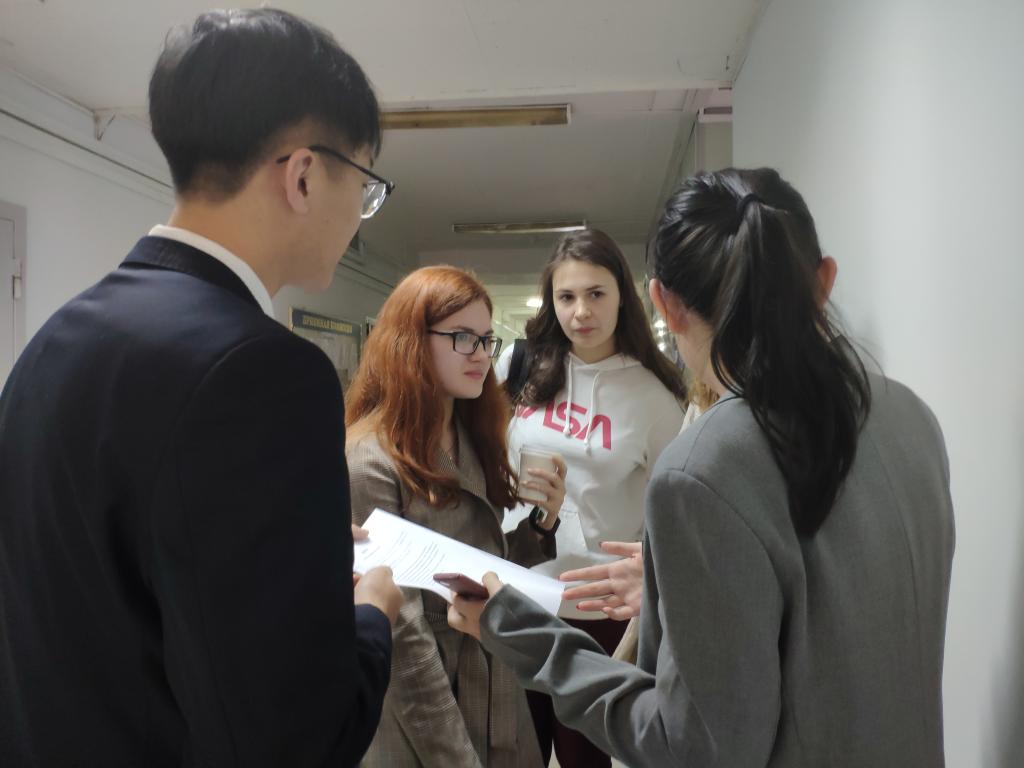课程结束后,调研团组同学现场发放调研问卷,同学们认真填写问卷,并和调研团组成员分享了他们在孔子学院学习和生活的经历。乔蕊老师也同林百学院长及两位老师进行了交流。调研期间,团组同学走进莫斯科大学校园,与莫大世界政治系及其他院系的同学开展了问卷调查和友好交流。