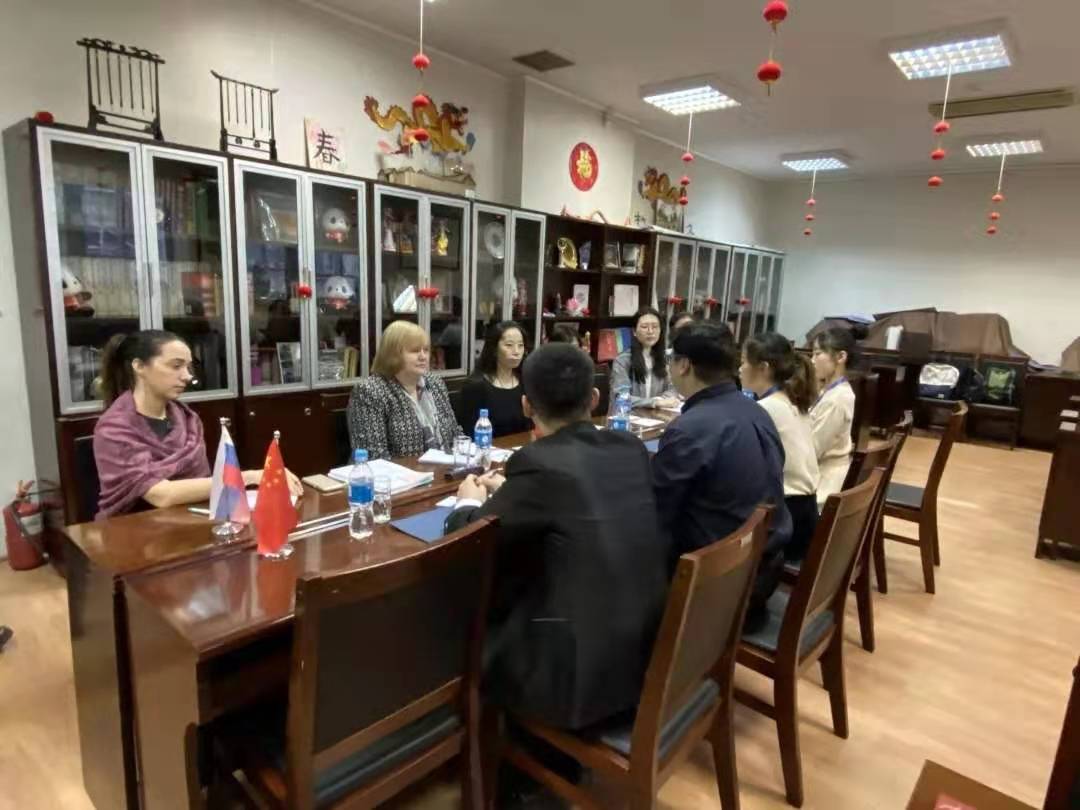 以远东联邦大学孔子学院娜塔莉娅•约瑟福夫娜副院长和近十位孔院教职人员与师生代表会见并展开座谈。