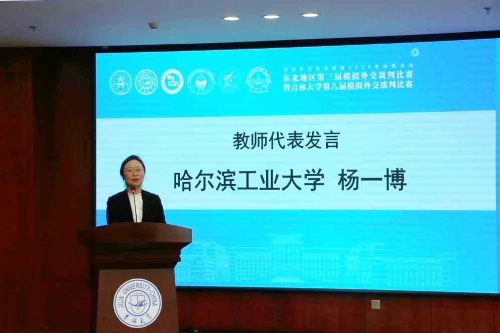 哈尔滨工业大学杨一博老师作为教师代表发言。杨一博在发言中表示,面对一个变乱交织的世界,中国外交人胸怀天下,自信自立,致力于守正创新和开放包容,书写着国际政治文明的新篇章。她强调了青年学子对国家未来的重要性,鼓励他们通过模拟外交谈判活动锻炼自我,为将来承担国家外交重任做好准备,与外交前辈们共同锻造中国外交的独特品格,开创中国特色大国外交,共同维护国家主权和民族尊严。