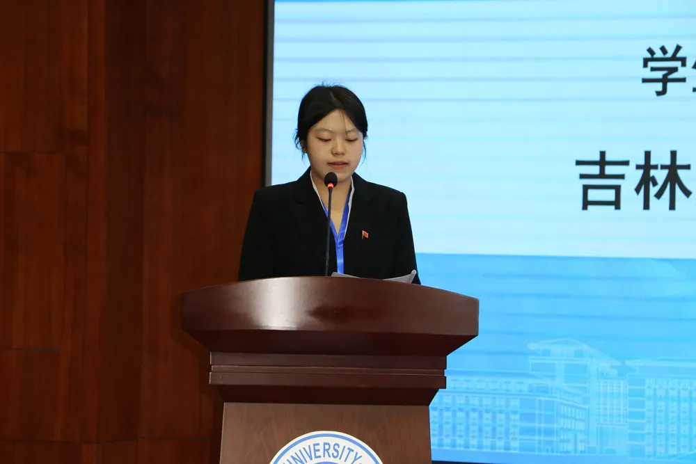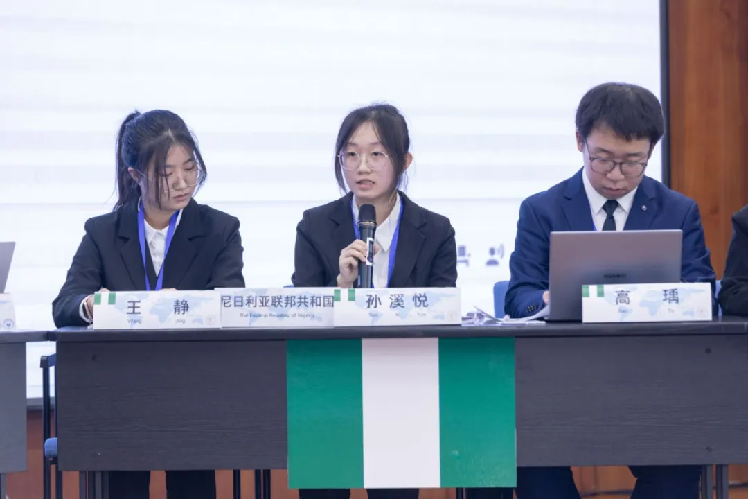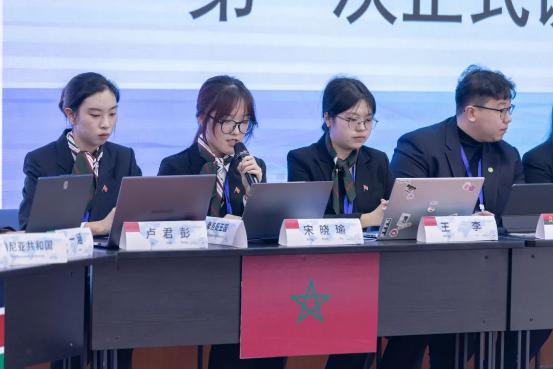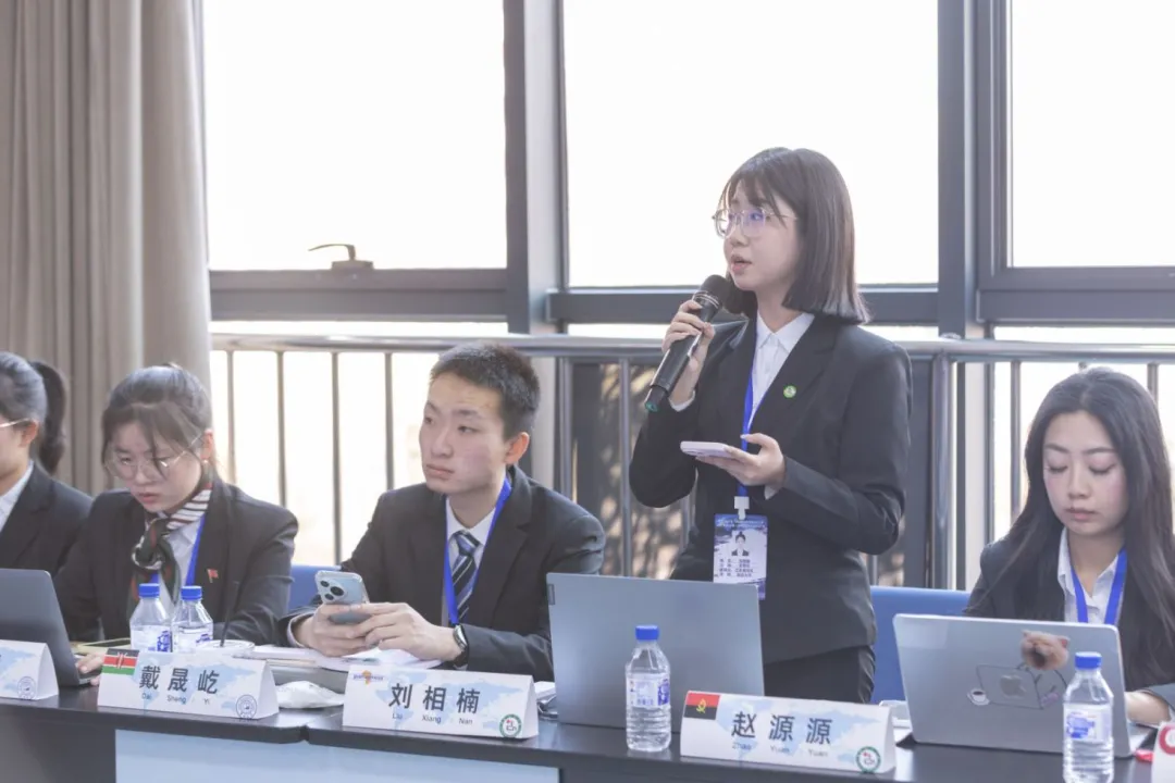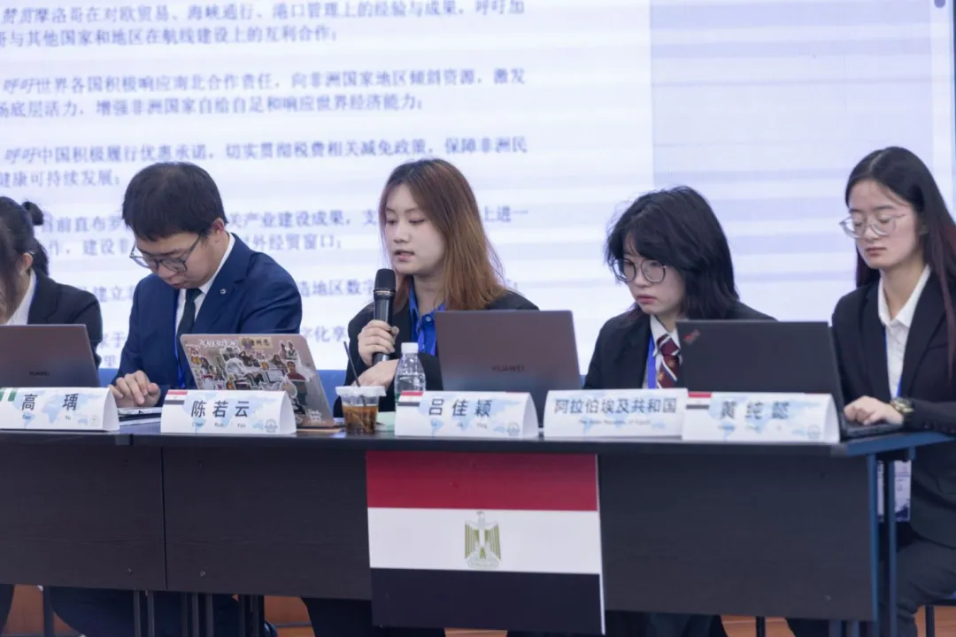 文学院2023级本科生王李同学作为参赛学生代表发言。她认为,模拟外交谈判不仅是一场竞技,更是一次学术与思想的碰撞,呼吁各位参赛选手在活动过程中不仅要推动“一带一路”倡议持续迸发活力,还要秉持世界眼光,协调各方利益,达成合作共识,展现出中非合作的潜力。