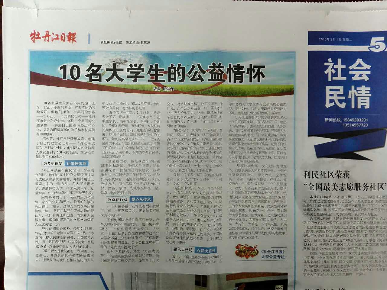 学生与其高中同学的公益故事,他们所创建的微信公众号——“牡丹江考试帮”,不到3小时微信群人数就达到了500人,文章点击量达到5000余次。小力量大汇聚,公益路上有你有我。