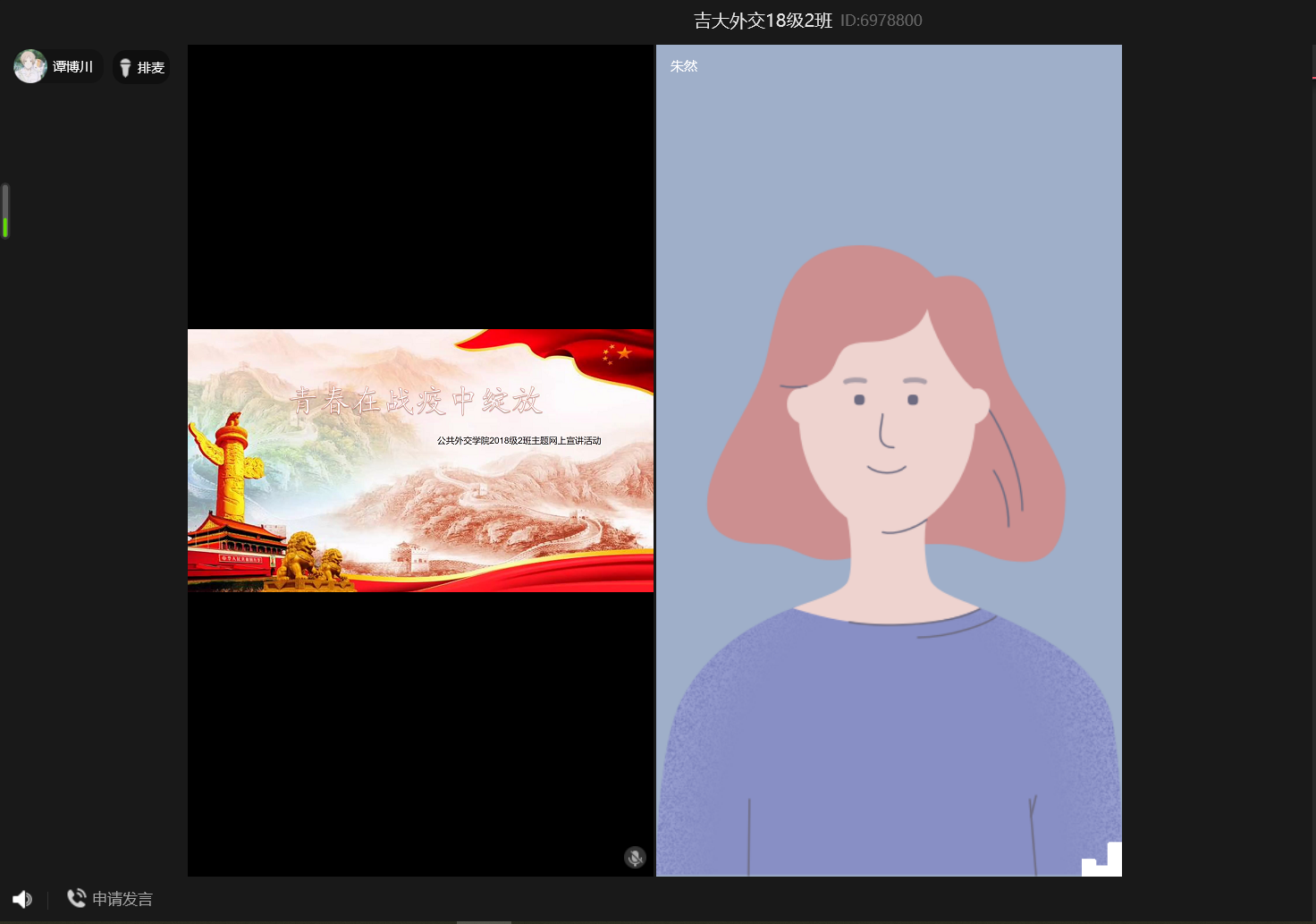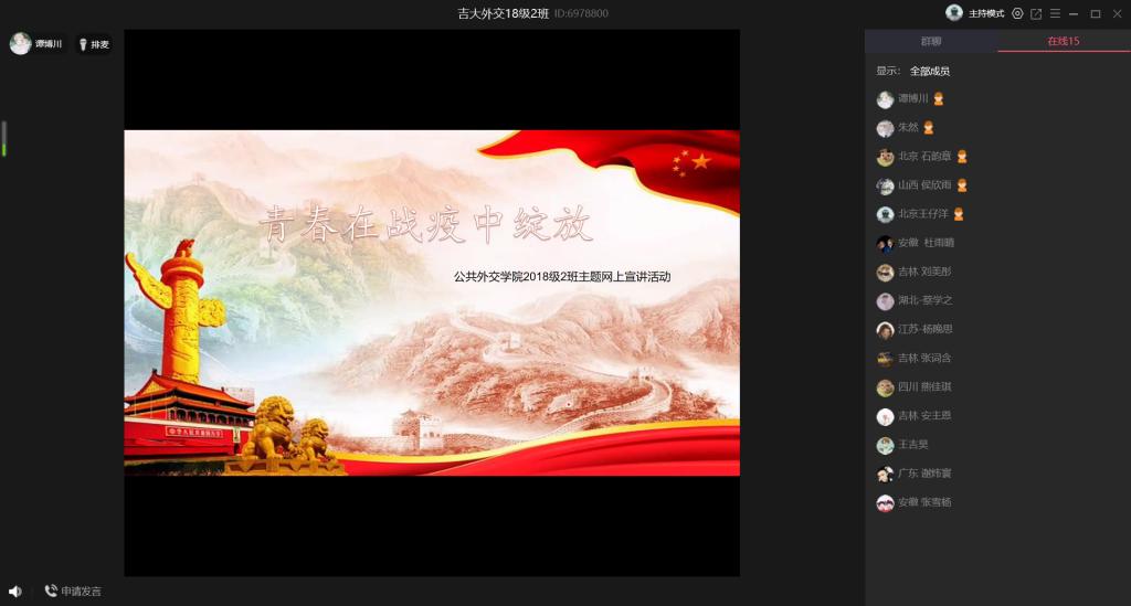 本次线上演讲活动由团支书谭博川主持,信思涵、朱然、谭云三位同学参与演讲。