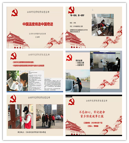 在“让青春在党和人民最需要的地方绽放绚丽之花”主题党课环节,王家辉、赵丹宁、邢晓曼、王思晓和孙悦五位学生党员分别就各自在疫情防控期间所进行的志愿活动依次做了报告。他们中有人协助事业机关开展线上新媒体宣传活动,通过分享转发官方的文章,传递正确的信息;有人投身到街道社区的防疫工作之中,帮助社区进行线上心理辅导和入户排查登记;有人参与到学院组织的线上课业辅导的“云端筑梦·与爱同行”志愿服务活动中;有身处疫情重灾区湖北地区的党员同志,在经历疫情带来的短暂的恐慌之后和家人投身到社区疫情防控工作之中,从事社区站岗与基层数据统计整理的工作;还有人分享了自己在经历海外交流学习被迫中断,回国隔离期满后投身到社区疫情防控工作之中的故事。