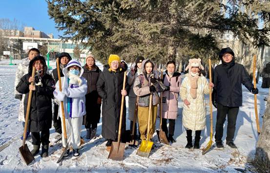 零下二十多度的体感温度和凌冽的寒风并没有让同学们抱怨,大家不怕辛苦、不畏严寒,为校园里的行人出行提供了便利安全的环境。