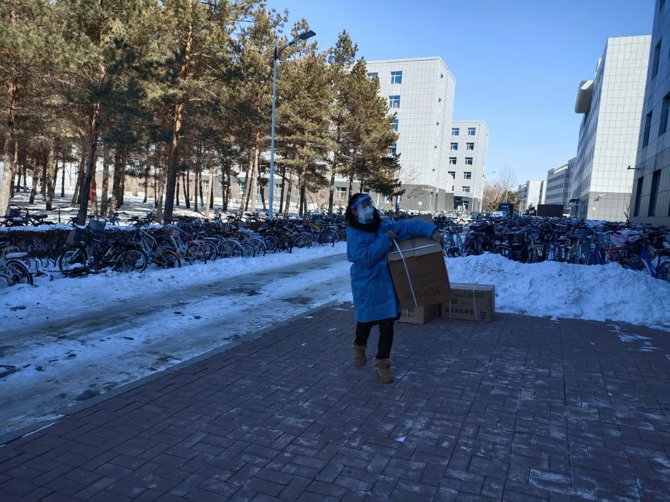 于晴老师负责北苑三公寓3700名学生的早中晚三餐、防疫物资、水、试剂盒以及学生购买的生活用品的发放;同时也负责全楼核酸试剂盒检测结果的统计以及巡楼工作。除此之外,于晴老师也会随时和各位同学与学院负责人沟通沟通,确保大家身心健康,保证事情能够及时传达给各位同学。