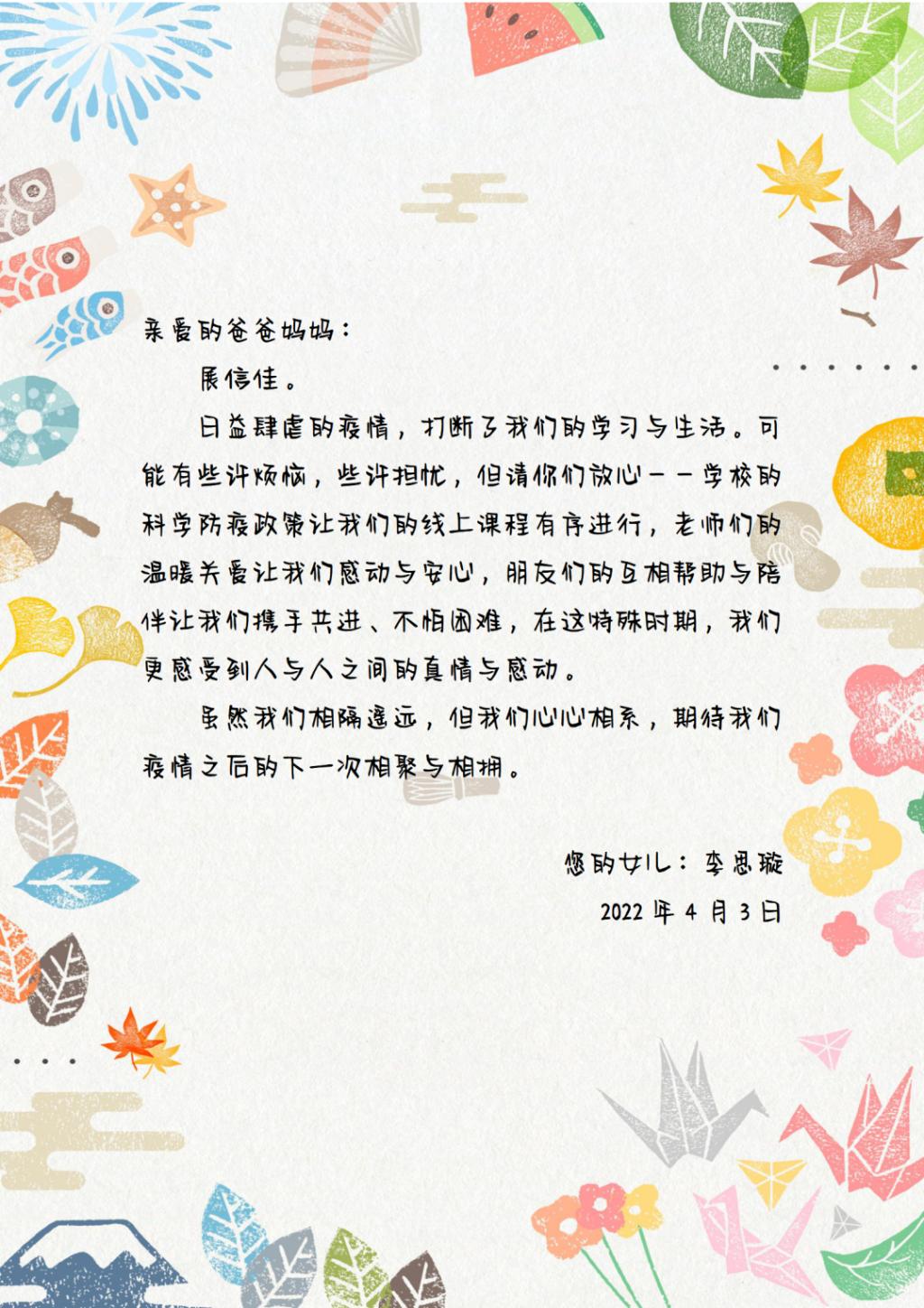 突如其来的疫情给大家正常的学习生活按下了暂停键,在封校的二十多天里,在与吉大同呼吸、共命运的二十多天里,在与老师、同学们一同抗击疫情的二十多天里,无数的思念与牵挂深埋心中,一个个情真意切的字眼,一封封绵绵真情的家书,承载着学子们赤诚的情意。我们也相信,当远方挂念着家中儿女的亲人们收到这些信的时候,心情一定是激动的、安心的。