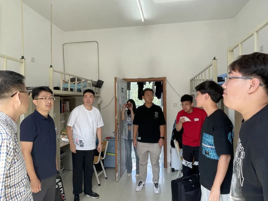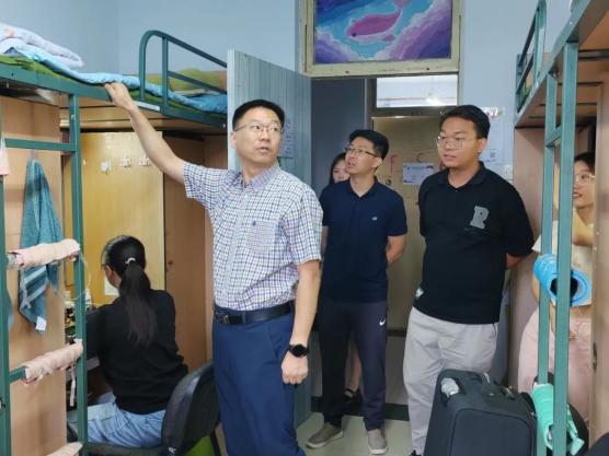 党委书记杨民老师、党委副书记兼副院长王力老师、2023级新生辅导员单葆龙老师走进学生公寓看望新同学们。