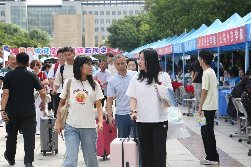 迎新现场,在志愿者引导下顺利完成身份审核、资料交接等工作,随后与父母一同游览校园,前往宿舍。在寝室接待站,22级的志愿者已准备就绪,为新生入住提供热心帮助。