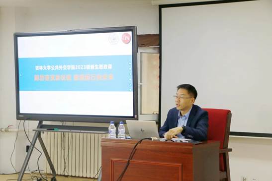 的优良传统和基本情况,鼓励同学们以先辈为榜样,赓续红色血脉,传承吉大精神。接着,杨民结合学院的基本情况,详细阐释了学院的办学理念和办学目标,鼓舞同学们踏实学习,用实际行动践行“世界眼光、家国情怀”的院训。随后,杨民详细介绍了新时代中国特色社会主义建设取得的伟大成就以及中国特色社会主义进入新时代的重大意义,并希望同学们牢记党的教诲,把握时代机遇,立志民族复兴。最后,杨民寄语同学们要树立远大理想、热爱伟大祖国、培育担当意识、磨练意志品质、提升个人修养,努力成为“信念坚定、学识扎实、为人朴实、作风踏实”,具有“世界眼光、家国情怀”的SIPA人。
