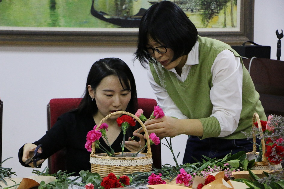 与此同时,学院妇委会为参加培训的教职工精心备好了插花材料:花篮、剪刀、洋牡丹、非洲菊、玫瑰花、满天星、尤加利叶、雪叶莲……教师们在周老师的指导下认真修剪,精心构思,尽情地发挥创作力,根据不同的色彩、形状,错落有致、色彩纷呈地将花材搭配在一起,变成了一件件具有艺术感、层次感的精美作品。